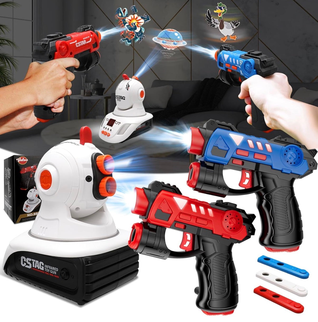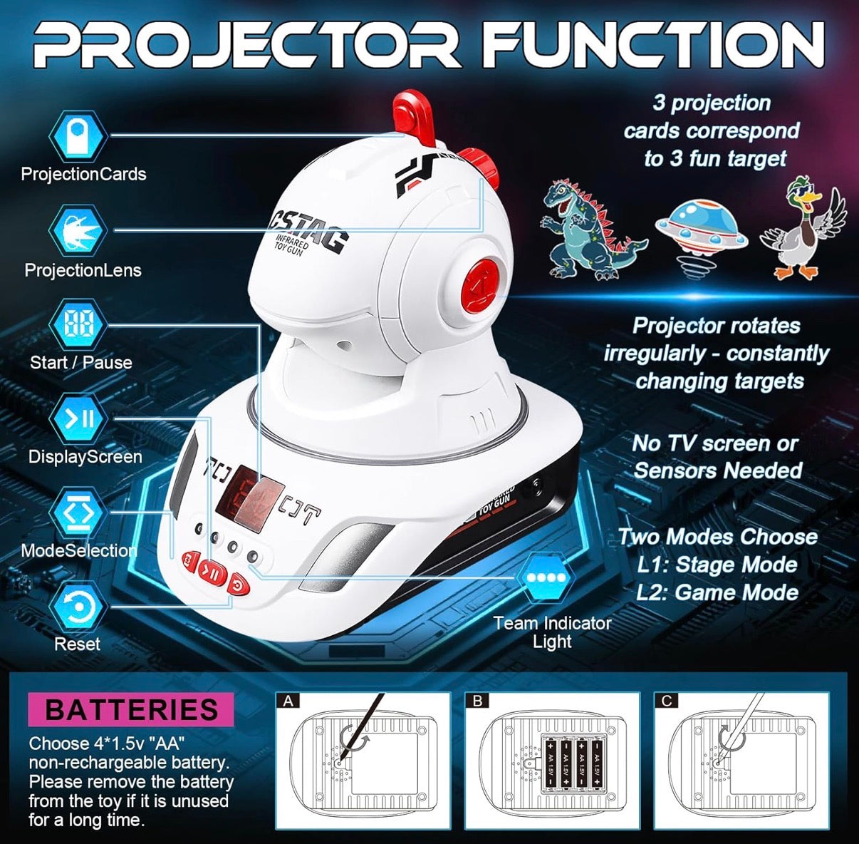 The device projects moving targets onto your wall, and players use the toy blaster to aim and shoot them for points
